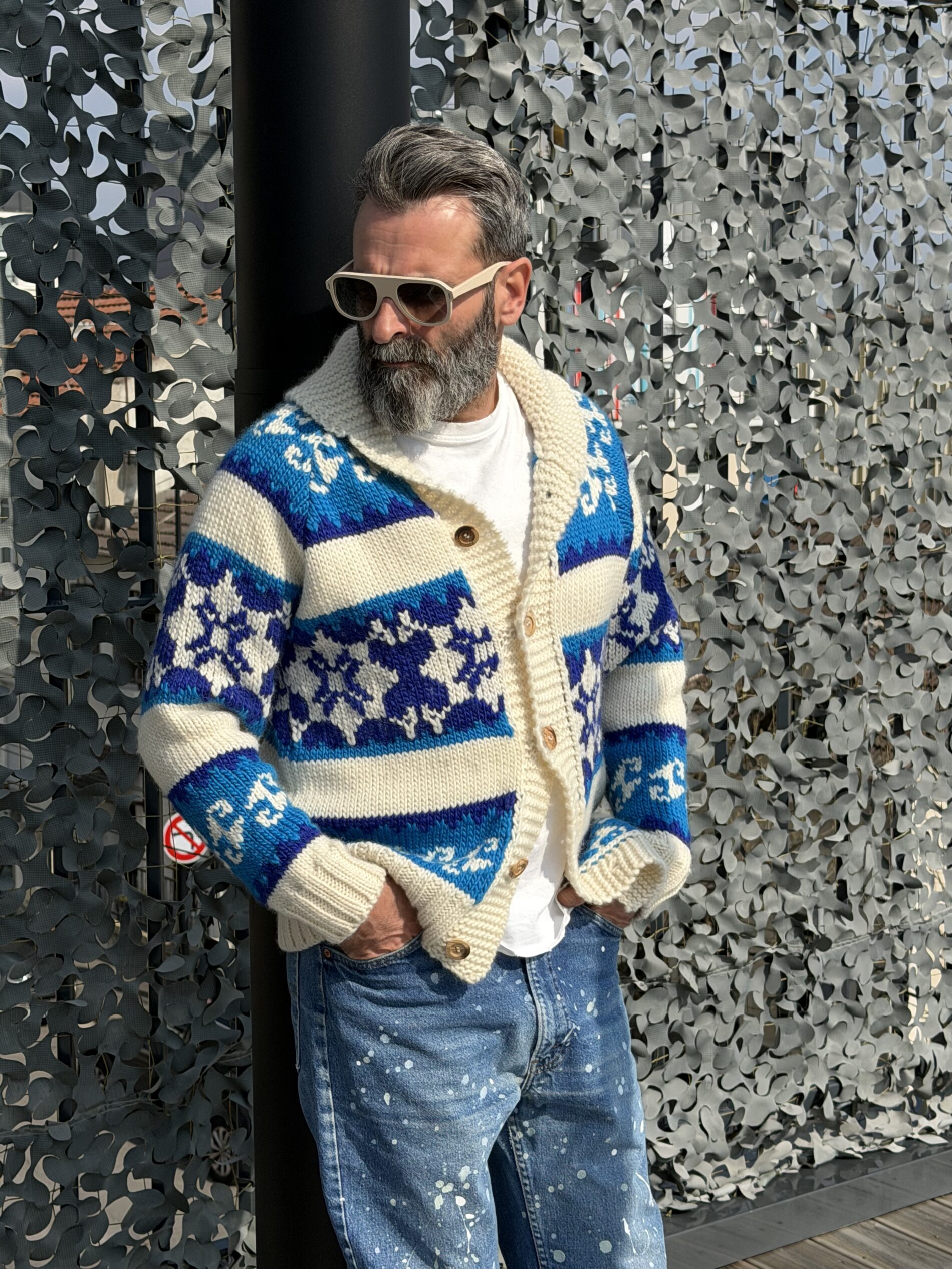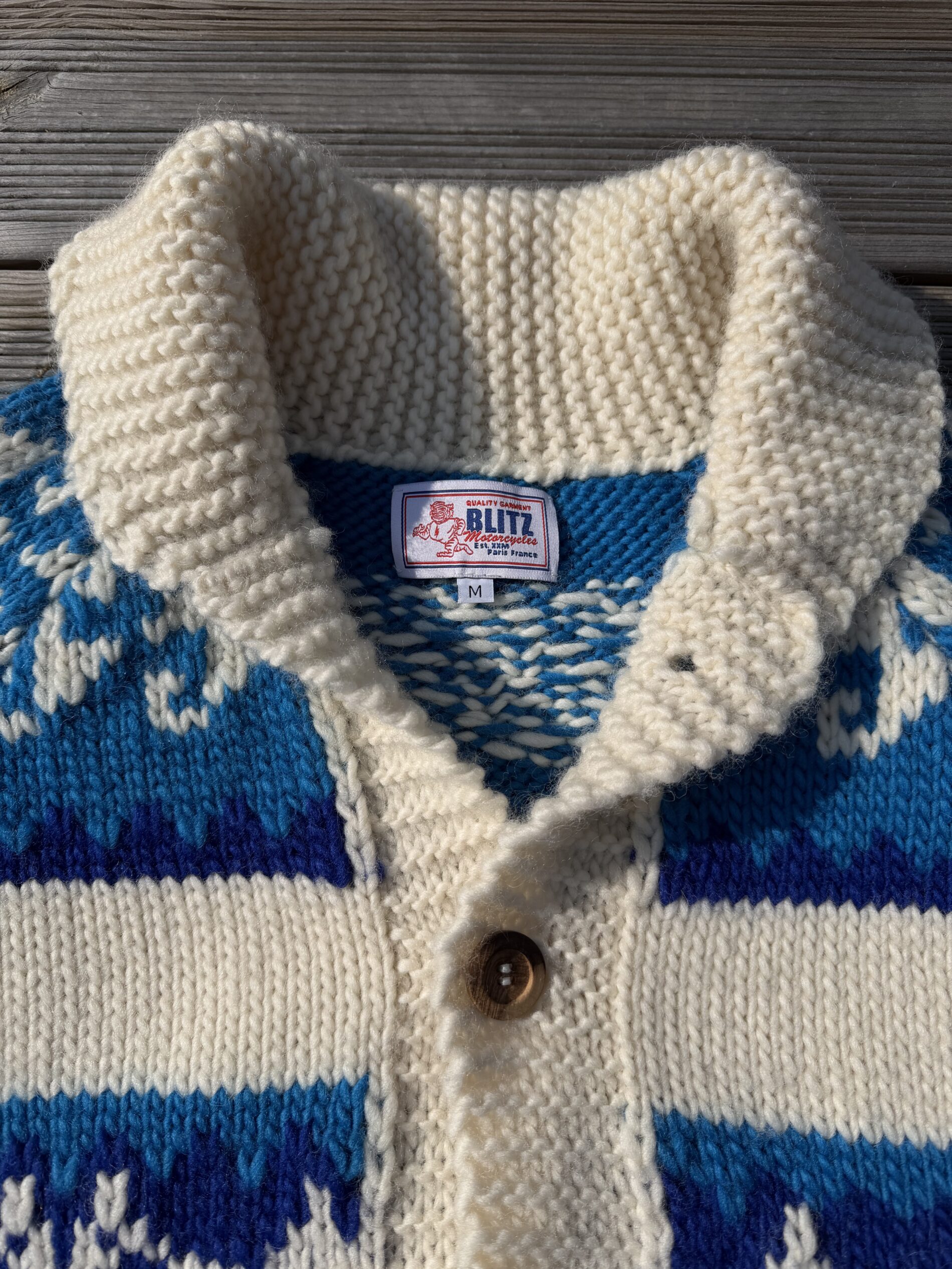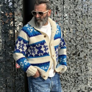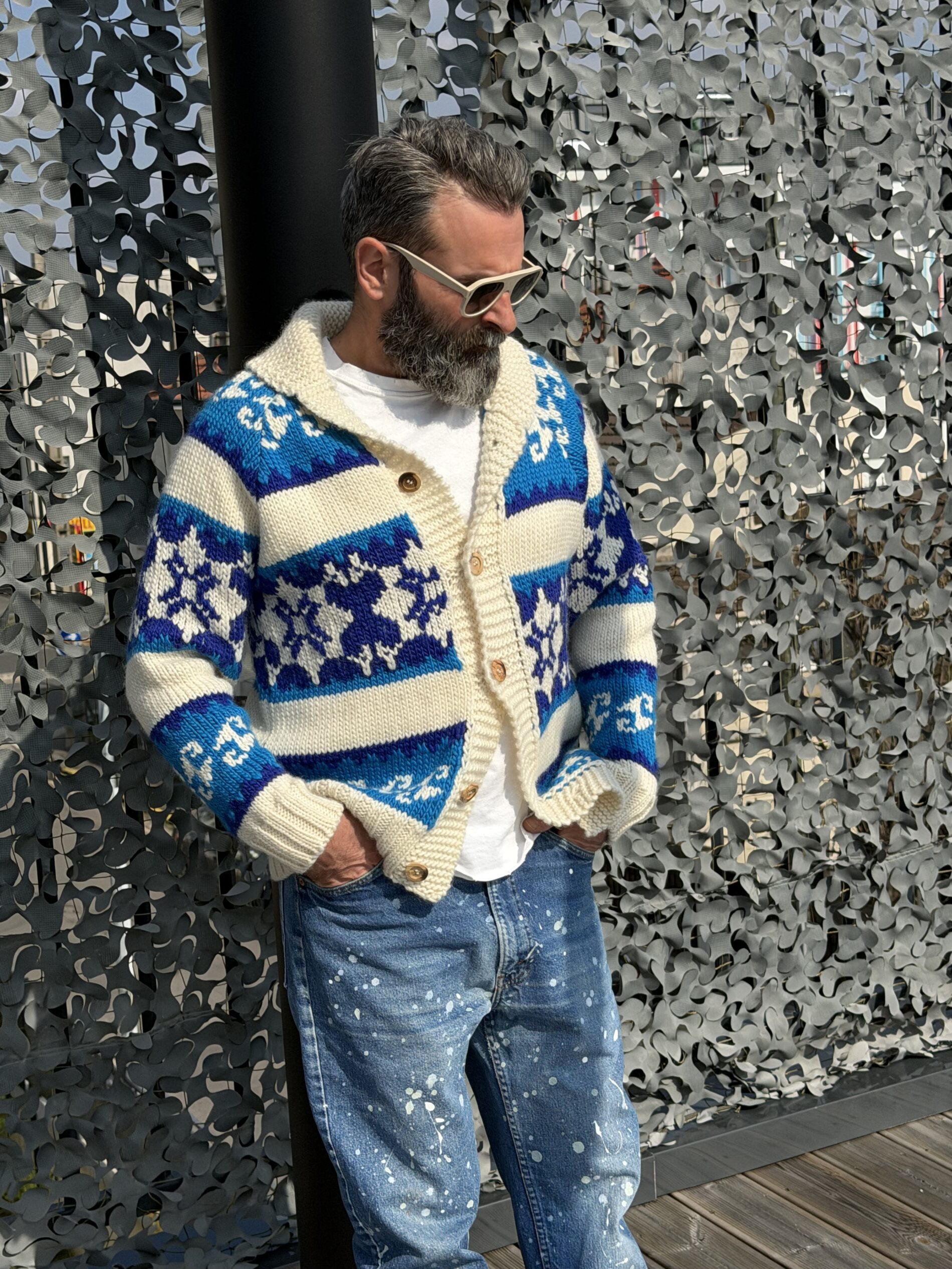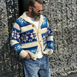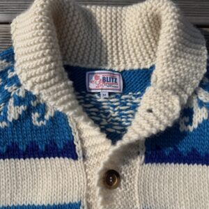 This “Cowichan” wool cardigan (cardigan originally made by First Nations people living in British Columbia at the end of the 19th century) is 100% made of wool, has a shawl collar and wood buttons.