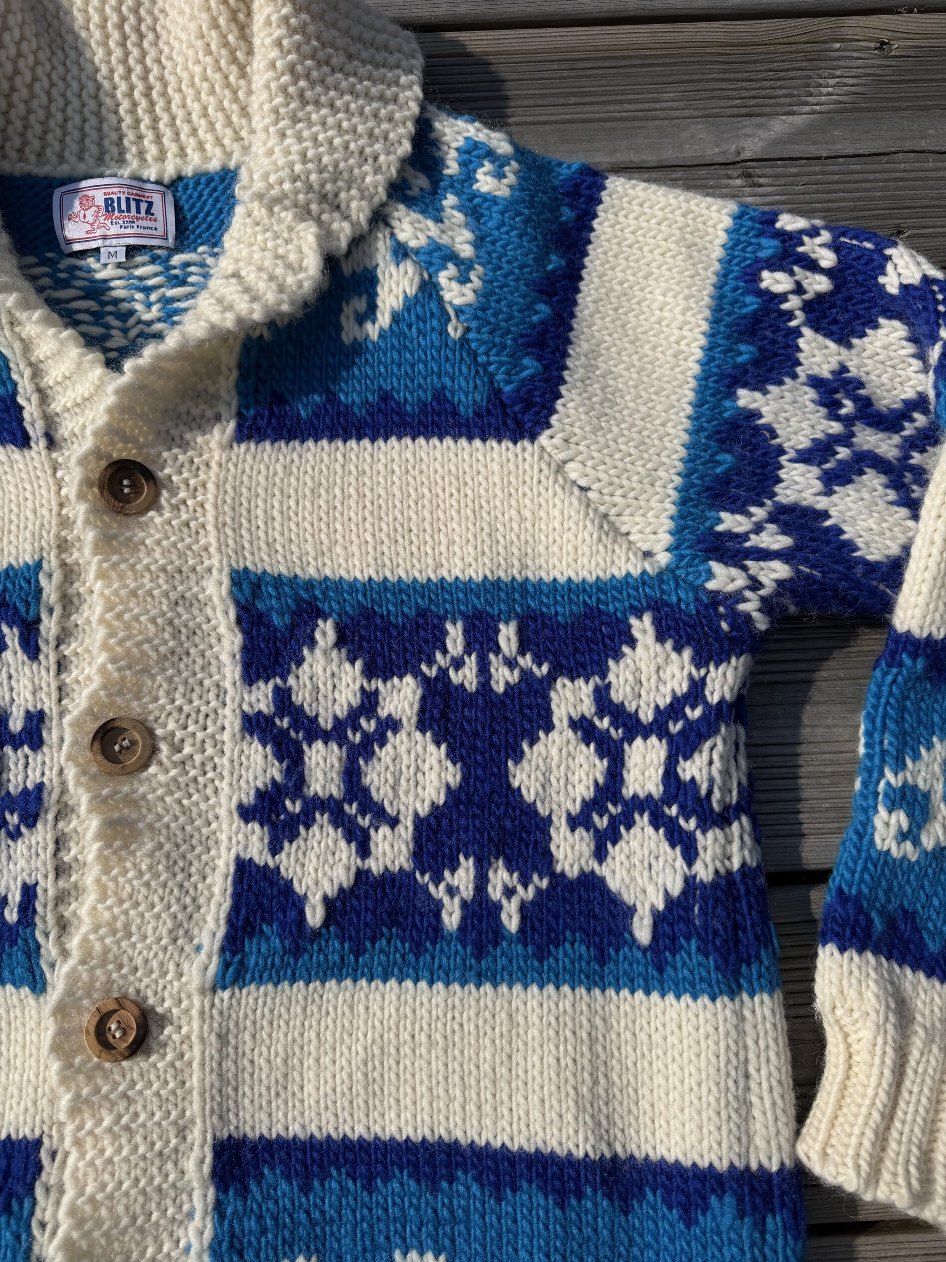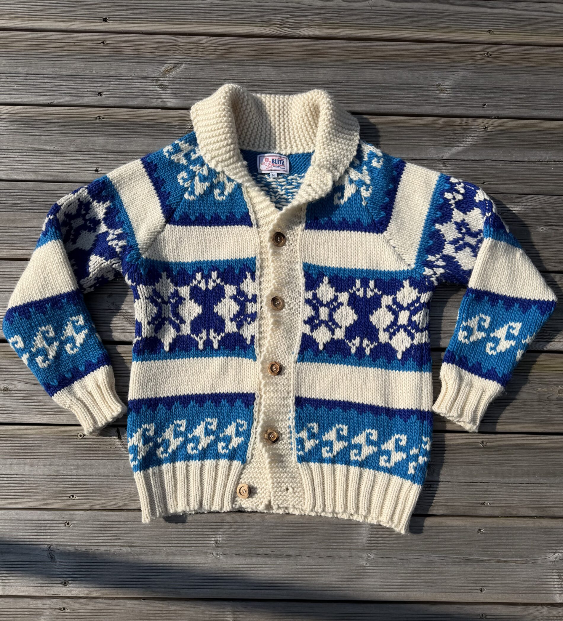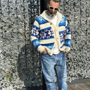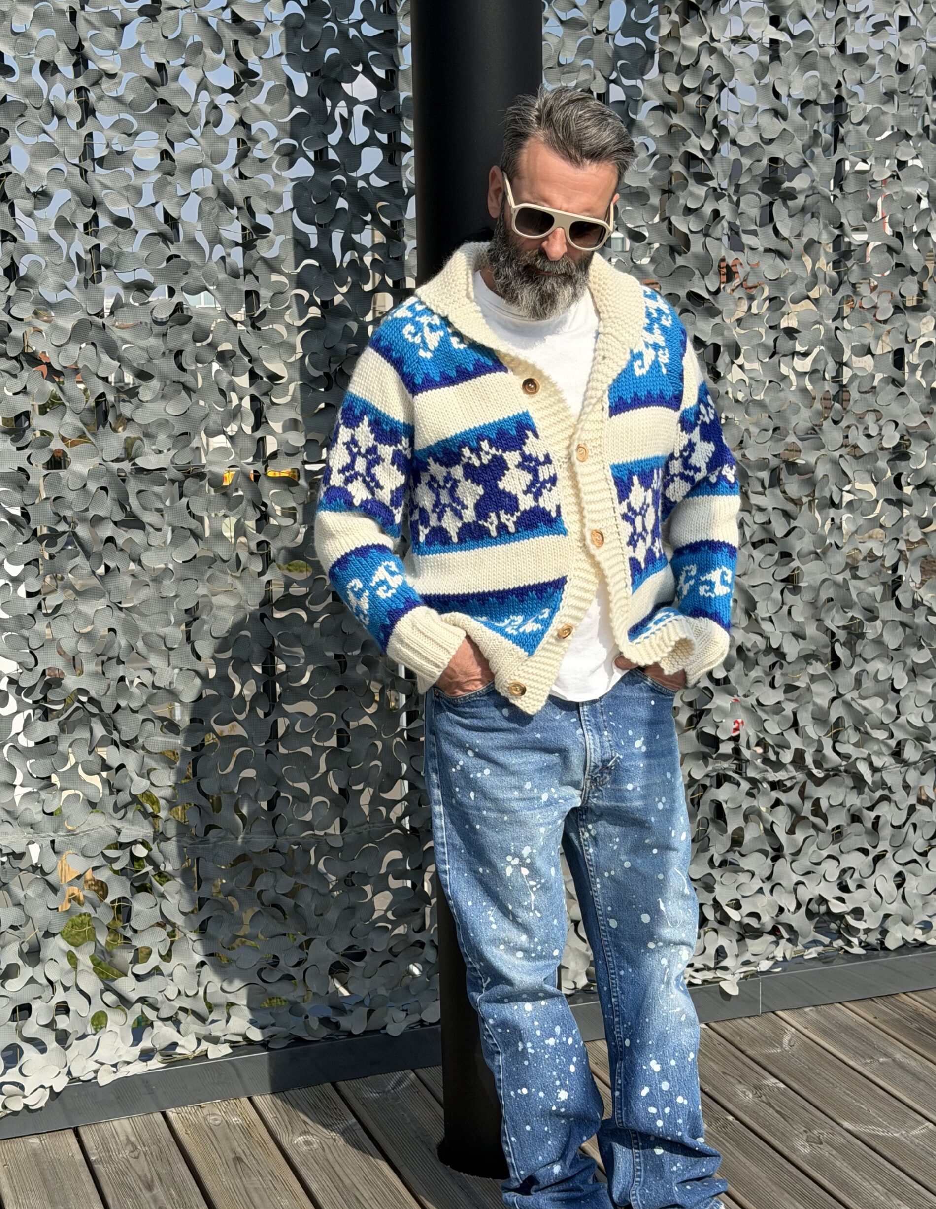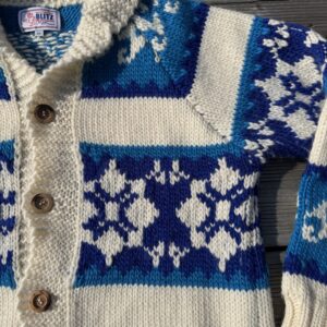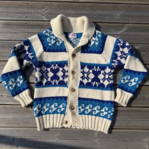 This “Cowichan” wool cardigan (cardigan originally made by First Nations people living in British Columbia at the end of the 19th century) is 100% made of wool, has a shawl collar and wood buttons.