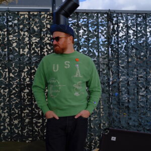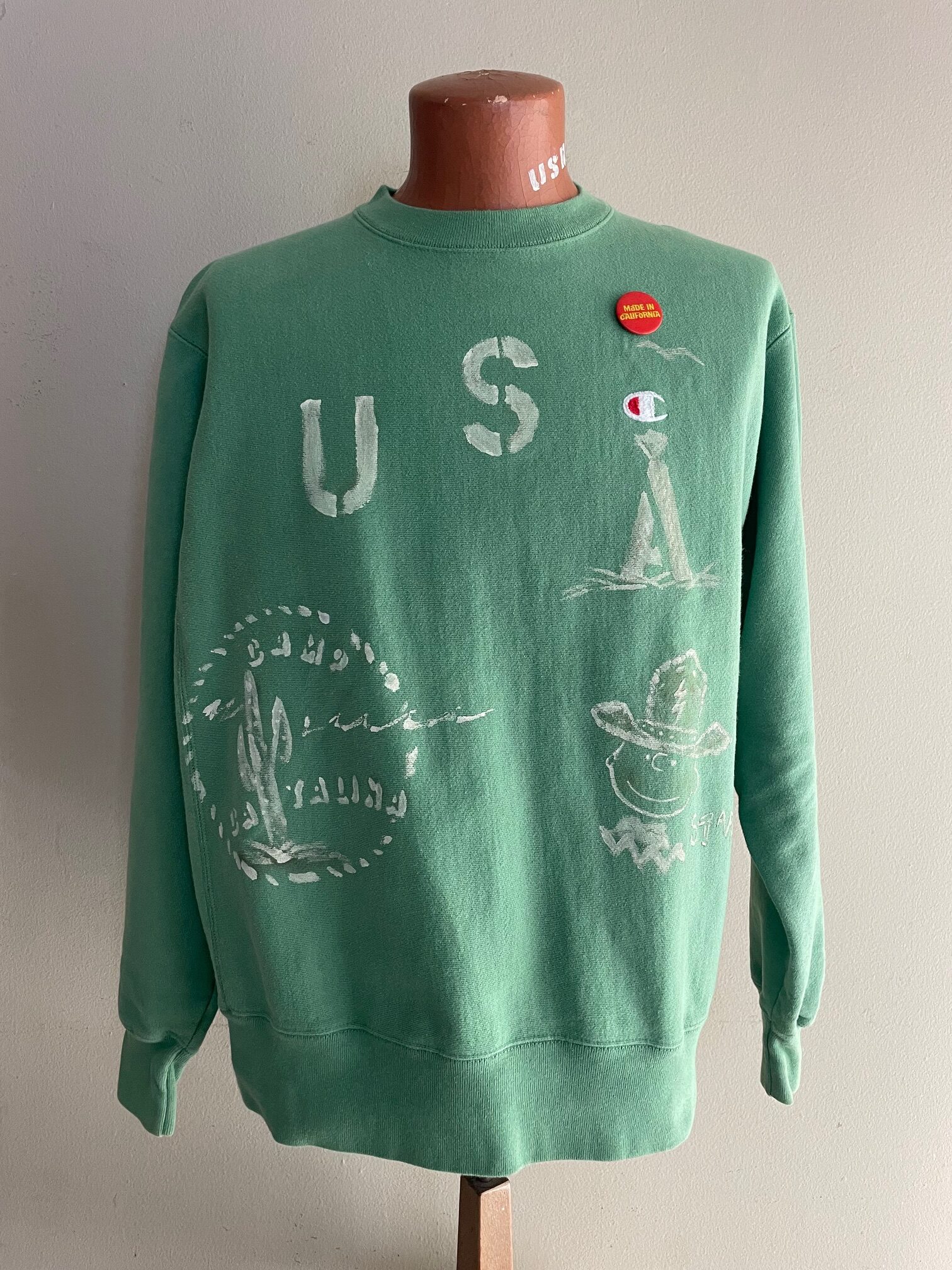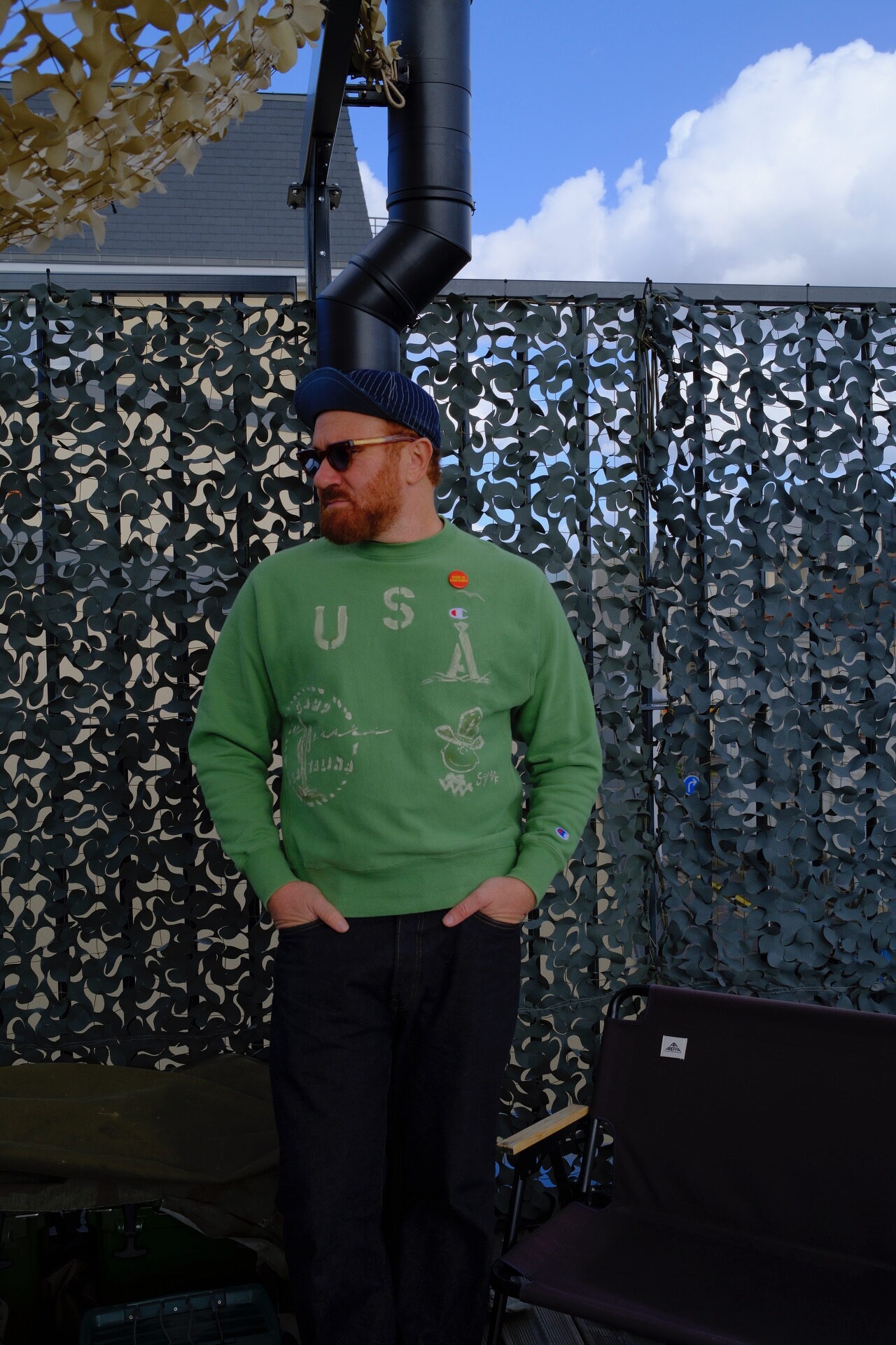 Here comes the “Camping” crewneck, based on a vintage green Champion USA sweatshirt and hand painted by US Rio Bravo. It comes with the hand made collectable pin “made in California”.