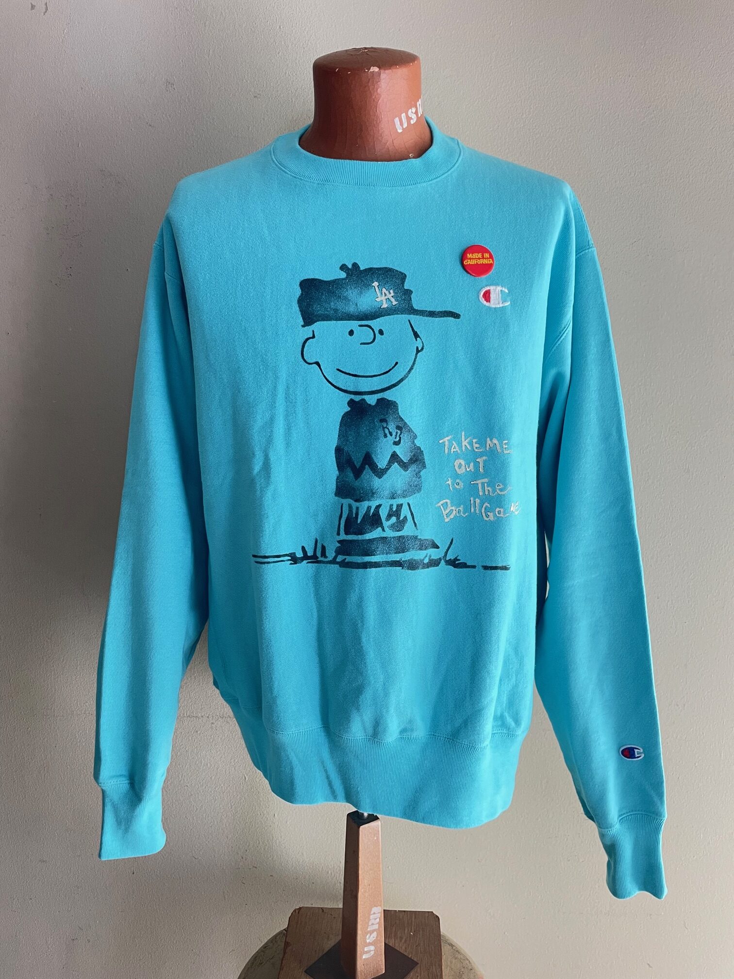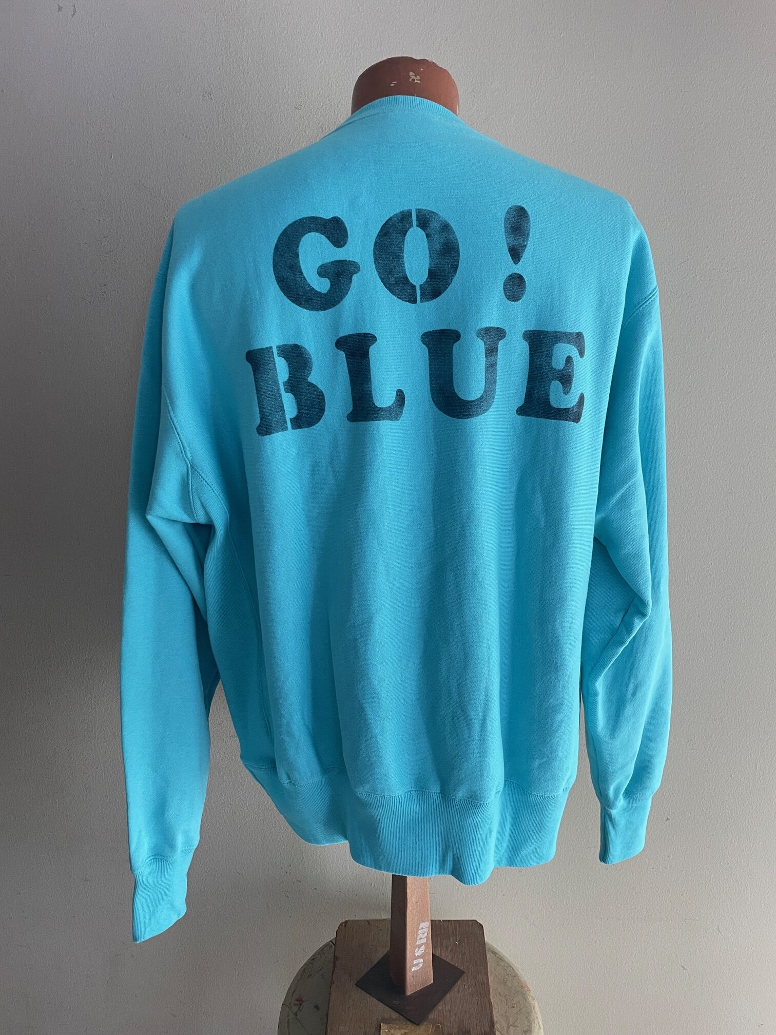 Here comes the “Go Blue” crewneck, based on a vintage Champion USA sweatshirt and hand painted by US Rio Bravo. It comes with the hand made collectable pin “made in California”.